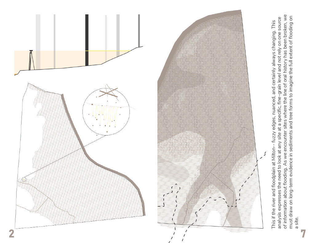 I think that a lot of our ill-advised decisions around “flood control” in the United States stem from the way that we imagine water, land, and floodplains. We create, both through lines on maps and built interventions such as levees, “safe” and “unsafe” zones that are mostly binary and do not change over time. At the same time, we have lost (murdered) or ignored a lot of the ancestral knowledge that could have helped us make better decisions at a local level. Many people and designers live and work in places where they do not have family history. How can they quickly gain an intuition for flooding, and communicate that to others, even without automatic access to an oral tradition? The 100-year floodplain will continue to exist and affect insurance and regulations, but it should not be our first or only source of information about where water may go in the future. Modeling, storytelling, and observation of the evidence on a site must be synthesized to create a nuanced understanding of a flooded place.
