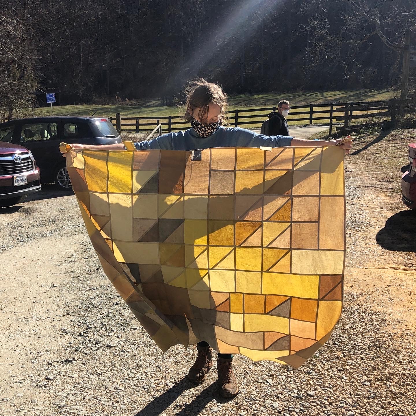 By accident, I realized the way that I was organizing the resulting dyed fabric colors resembled traditional color palettes used in design and art. This association pushed me to apply what could be called seasonal color palettes to photos of the landscape that defined a given walk for me. As the harvester and dyer, the resulting images captured my walks and the dye process better than site documentation typically emphasized in landscape architecture degree programs, such as a photomontage. Overall, this experiment provoked my preconceived ideas of seasonal color, which I’d categorize as fairly traditional (e.g. warm red, orange and gold tones for fall, bright green and yellow for summer, etc.) prior to this experience. For example, rather than defining an entire 3-4 month season with a few colors, there is a great visual difference in at least central Virginia’s landscape in early October (top right image) as opposed to late October (bottom center image) that the processes of harvesting and dyeing helped to reveal. Images in chronological order from the center top image (09-17-20 walk) to the bottom right image (11-08-20 walk).